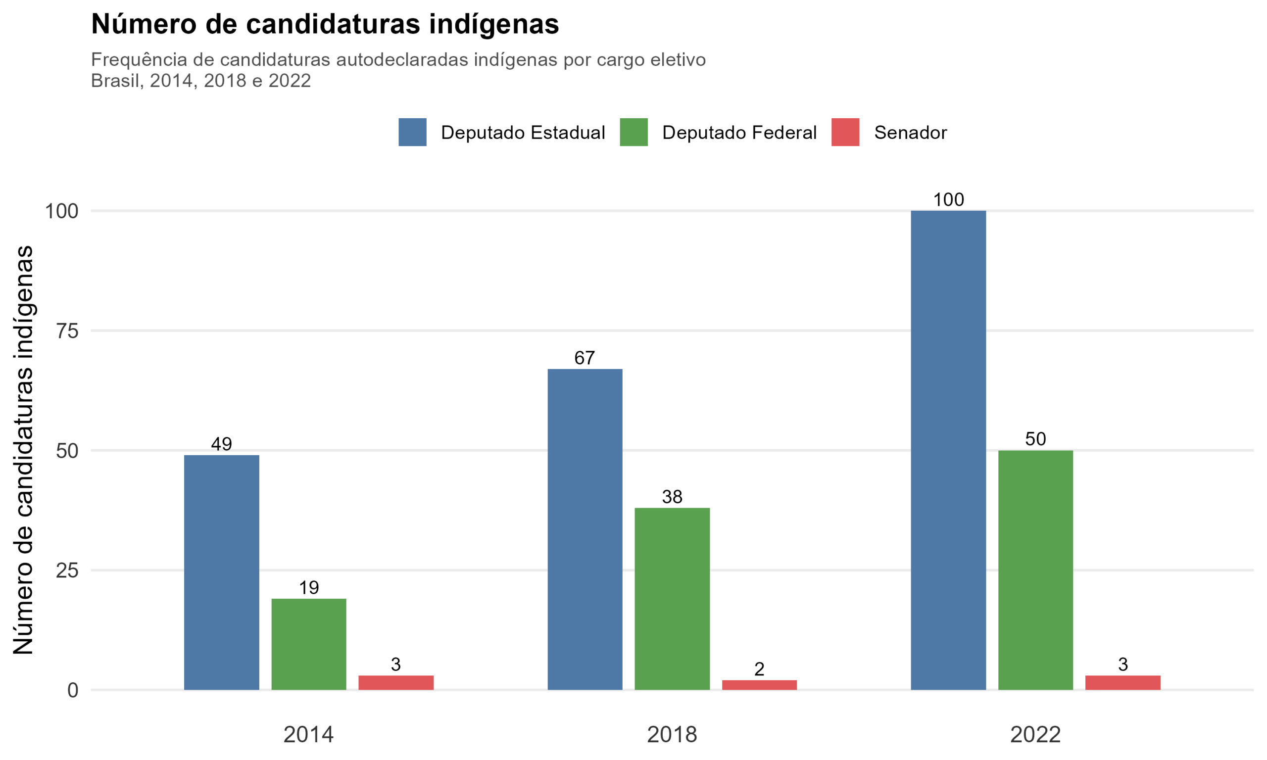 Gráfico 1 – Candidaturas indígenas no Brasil aos cargos de deputado estadual, deputado federal e senador (2014 – 2022)